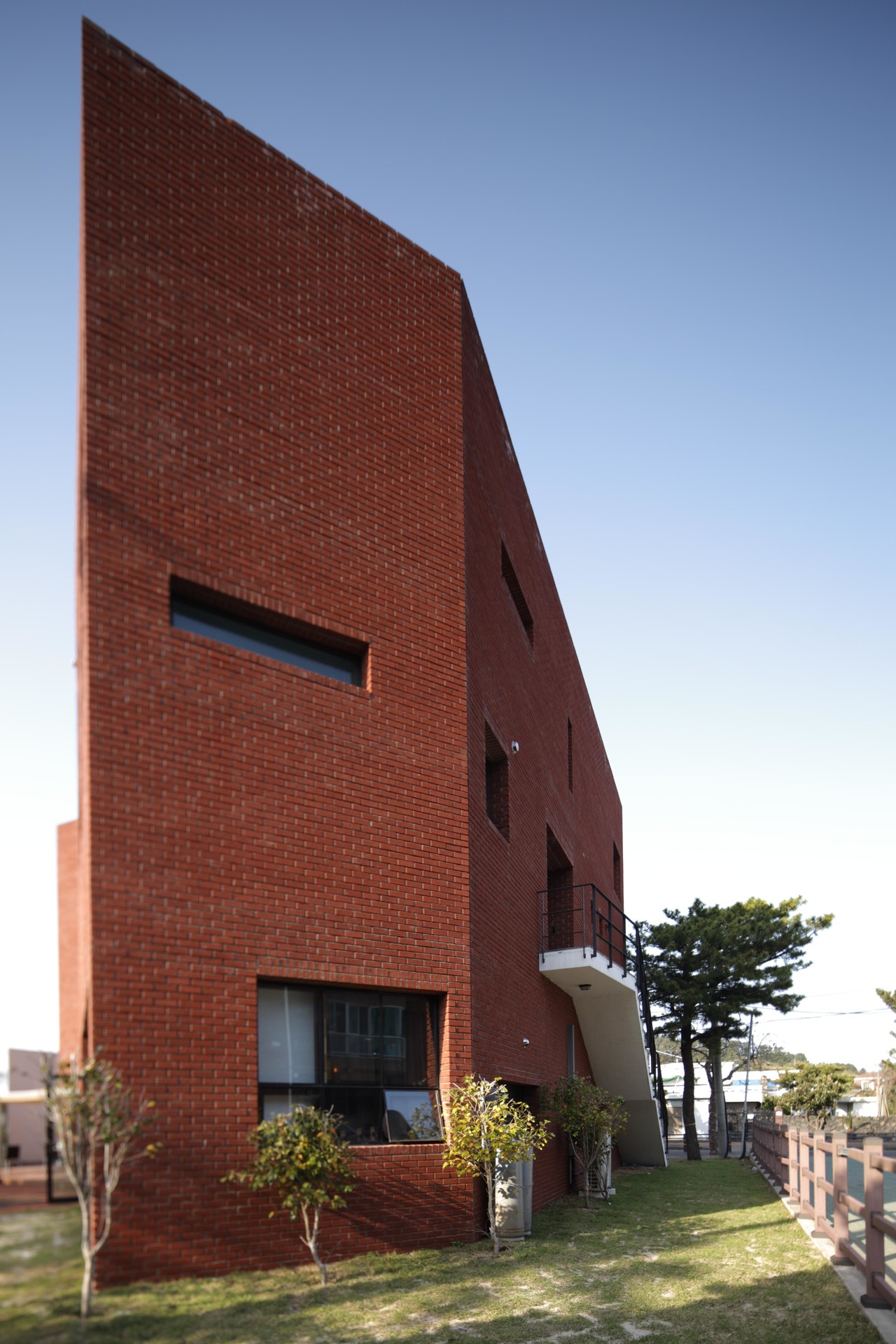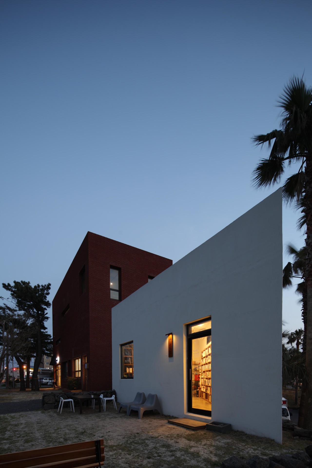 함덕 해수욕장과 서우봉, 그리고 대형 리조트가 인접한 삼각형 대지의 효율적 활용이 이번 프로젝트의 핵심이었습니다. 각이 완만한 영역은 주거 공간으로, 날카로운 예각의 영역은 건축주의 업무 공간인 서점으로 분리하고 그 사이를 주차 동선으로 풀어냈습니다. 붉은 벽돌의 주거동과 흰색 외단열 뿜칠로 마감한 서점동은 대비를 이루며 지역 경관에 활기찬 리듬을 더합니다.